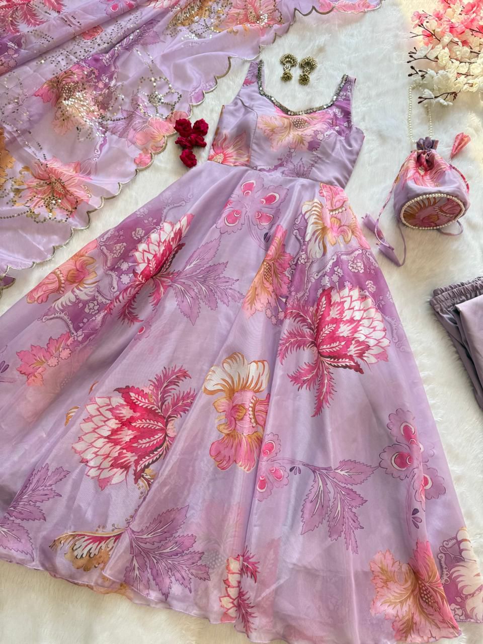 Anarkali suit - pure Jimmy organza silk digital printed padded anarkali with mirror work on neck !!48+. Anarkai length !!4,5Mtr Flair outfit !